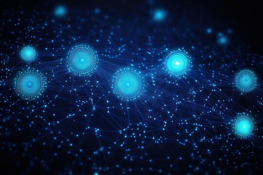 Glowing blue circular hubs linked by a web of luminous points and lines on a dark background, evoking a futuristic, mysterious sense of digital connectivity and motion