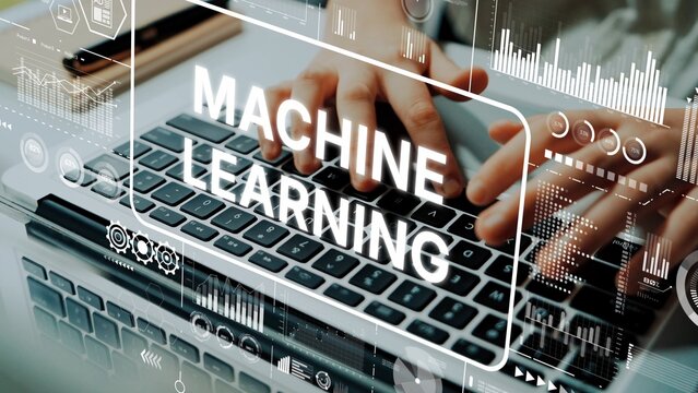 Hands Typing on Laptop Keyboard with Machine Learning Concept Overlay and Analytics Graphics. Asymptotic smart data analytic.
