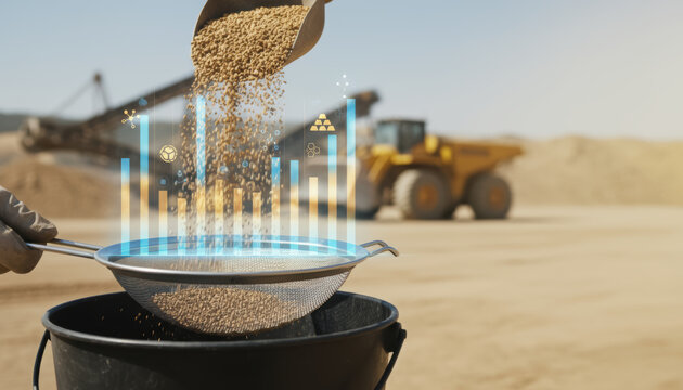 Gold mining data analysis concept with gravel sieve and digital chart overlay on construction site background