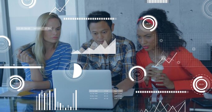 Analyzing team in red blazer, striped top at silver laptop holding coffee cup showing data overlays