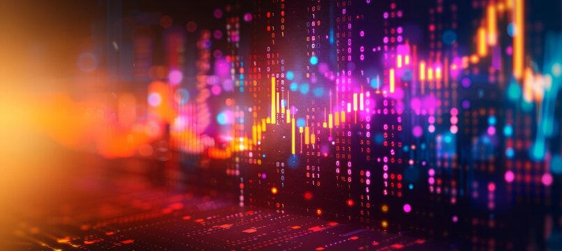 Dark stone surface reflecting a blurred cityscape at sunset, overlaid with translucent orange bar graphs, showcasing urban development and financial growth