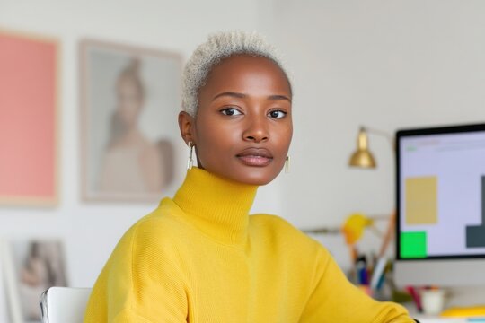 Young woman with short white hair and yellow turtleneck sweater working on desktop computer in modern design studio