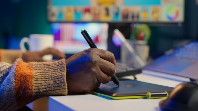 African american photo designer retouching images on dual monitors in a tech driven industry, representing modern digital media. Male graphic artist uses software tools. Camera A.