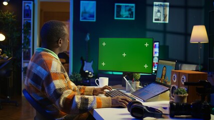 African american photo designer retouching images next to green screen on dual screens in tech driven environment, representing modern digital media. Graphic artist uses software tools. Camera A.