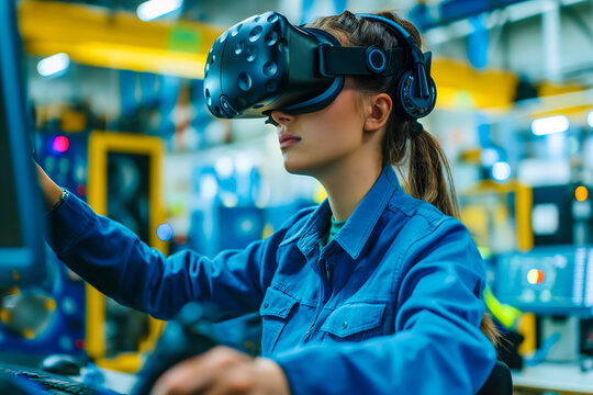 Female industrial engineer using VR technology for industrial design, development and prototyping at her workplace in factory. Future, technology and industry concept