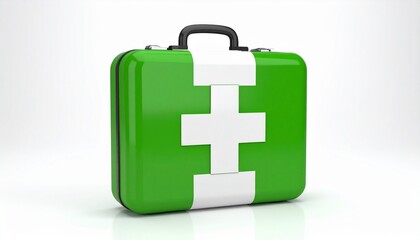 A green suitcase with a bold white cross design sits upright with a black handle, evoking themes of emergency readiness, travel safety, or medical transport in a clean, graphic style.