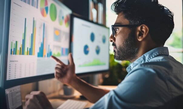 man data analyst examines colorful graphs on monitors for business strategy, person looking at finance charts in office