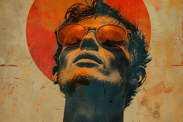 Man with sticky notes on forehead in artistic mixed-media collage