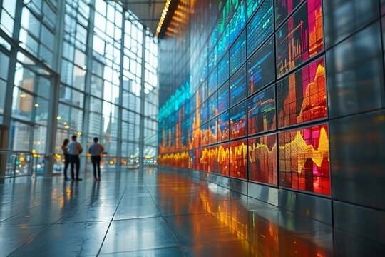 Financial data charts overlaying office interior