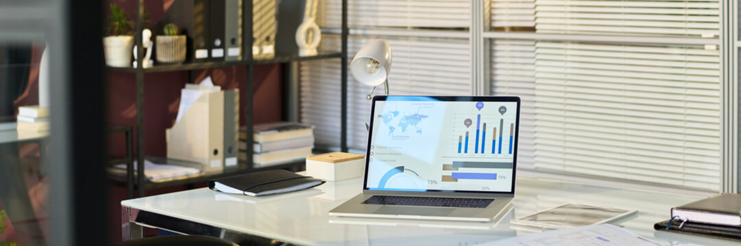 Banner of laptop with graphic information on screen standing on workplace of modern office worker against shelves