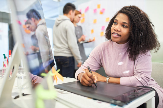 Diverse graphic designers collaborating on project in modern office