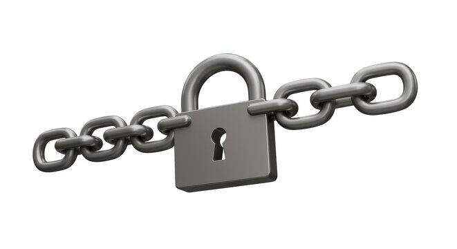 Isolated 3D Render of Silver Padlock and Chain Security Concept