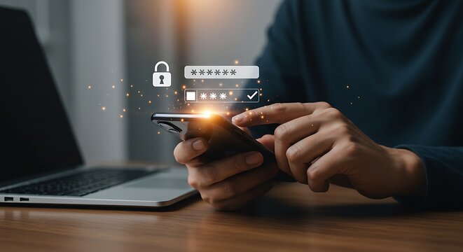 Person securely logging into mobile device with password and authentication icons overlay