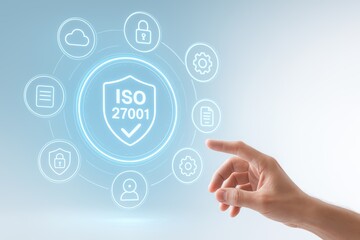 ISO 27001 Cyber Safety: A person's finger touches an illuminating, graphical presentation of ISO 27001, with an eye on data safety, compliance, and security.
