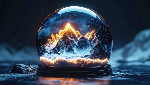 Snowy mountain range in a glowing glass sphere