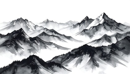 Black and white watercolor painting of a mountain range