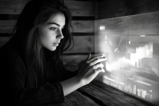 A young woman interacts with a futuristic transparent screen displaying data visualizations.
