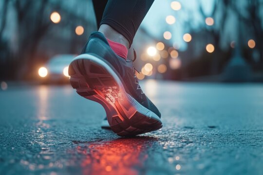 A detailed image showcasing the running shoes and feet of a person in rapid movement, A runner's graphically displayed sprained foot, AI Generated