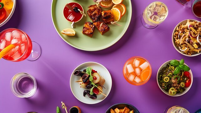 An appetizer plate with shot drinks laid out graphically on purple background : Generative AI