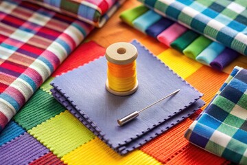 Colorful fabric swatches with a sewing needle and thread beside a miniature icon of a shirt, representing textile design and fashion inspiration.