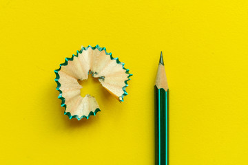 Close-up of a sharpened yellow pencil with graphite shavings