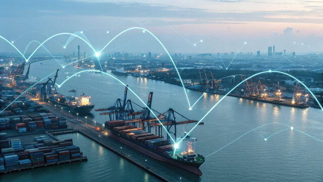A futuristic depiction of tariffs using holographic trade graphs over a shipping port, visualizing fluctuating costs and economic restrictions in a digital finance landscape.