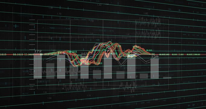Displaying seven gray vertical bars and overlaying line graphs on dark dashboard, with teal grid