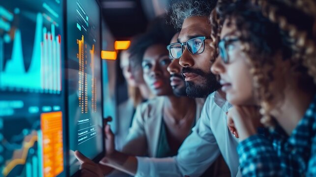 Generative AI : group of professionals looking at a large computer screen displaying data graphs