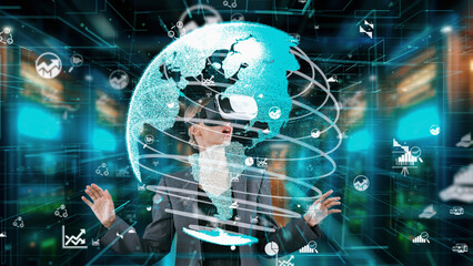 Businesswoman looking dynamic market data research analysis rotated world graph monitor by VR global innovation interface digital infographic network technology visual hologram animation. Contraption.
