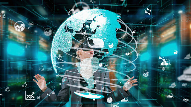 Woman looking around analyzed world circle finance data graph by VR global market interface digital infographic network technology virtual 3d animation cyberspace meta innovation server. Contraption.