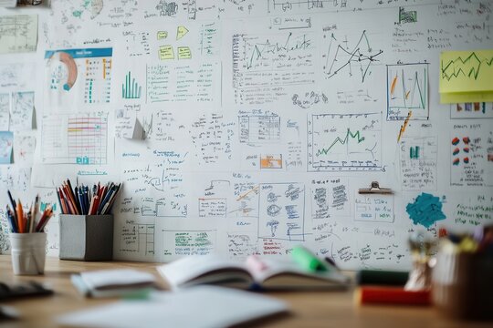 A blackboard filled with intricate mathematical equations and formulas written in colorful chalk, A colorful chalkboard with various mathematical equations and drawings on it