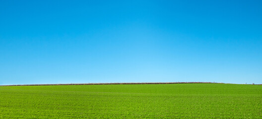 Lush green hills under a vibrant blue sky. Gentle rolling hills of vibrant green grass stretch into the distance, against a clear cerulean sky