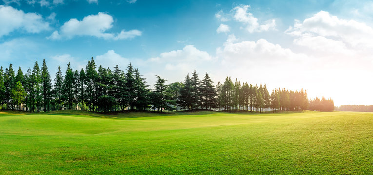 A natural spring garden background of fresh green grass with a bright blue sunny sky with a wooden table to place cut out products on.