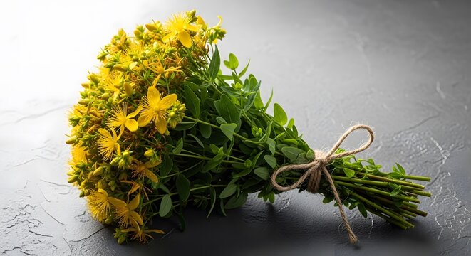Freshly picked st. john's wort bouquet with vibrant yellow flowers tied with rustic twine