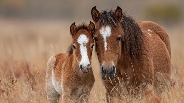Young foal playfully exploring grasslands alongside its mother evoking tenderness and innocence