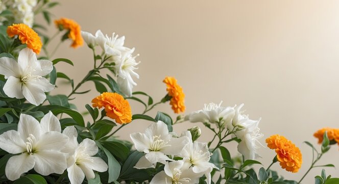 Elegant Floral Border of White Jasmine and Orange Marigold Flowers with Green Leaves on Beige Background