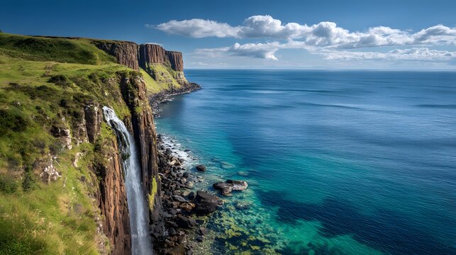 Tall cascade plunges from grassy cliffs into vibrant blue ocean waters under sunny skies
