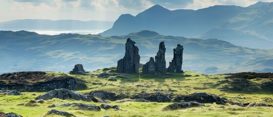 Tall Rock Formations on a Scottish Isle With Distant Mountain Range