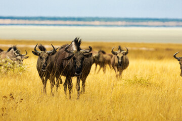 A herd of wildebeest standing on a grassy plain