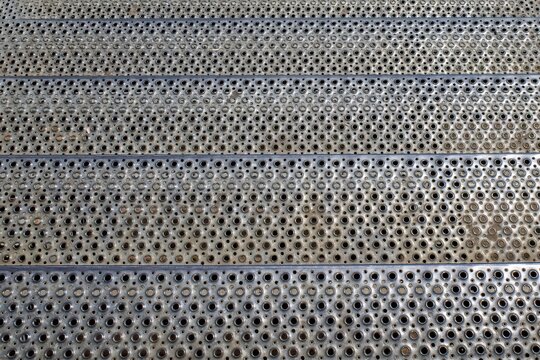 Stair steps made of perforated stainless steel. Perforated background.