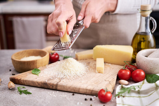 Woman grates Parmesan cheese on a wooden cutting board at domestic kitchen
