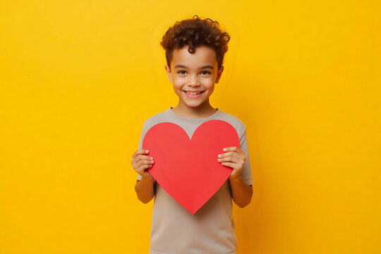 Kid boy holding paper heart. Love and valentine day and gratitude concept