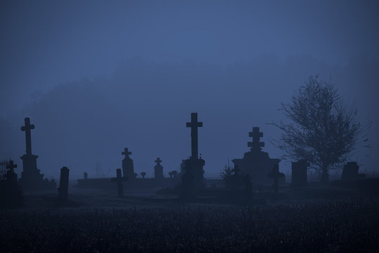 A misty graveyard scene with tombstones, fog, and a full moon in the background