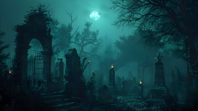 The haunting graveyard illuminated by a full moon under stormy skies.