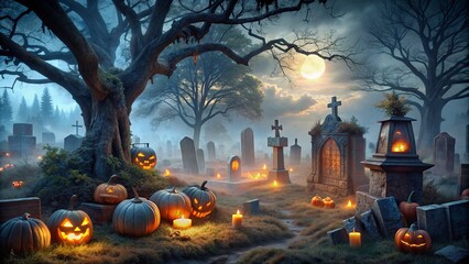 Eerie graveyard scene at dusk with jack-o-lanterns aglow amidst crumbling tombstones, surrounded by twisted tree branches and spooky fog, on a dark halloween night.