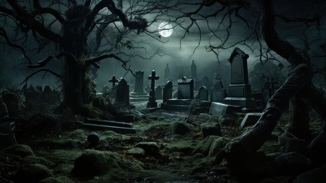 Eerie cemetery with tombstones under moonlight