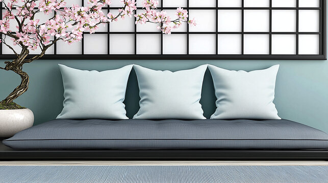 In a modern living room adorned with mid-century design elements, a sleek art poster frame hangs above a gray bench against a pristine white wall, adding a touch of sophistication to the space