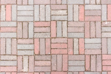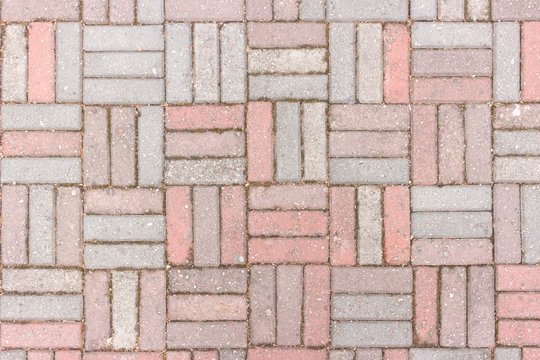 Brickwork of pink and gray bricks, uniform texture background, close-up