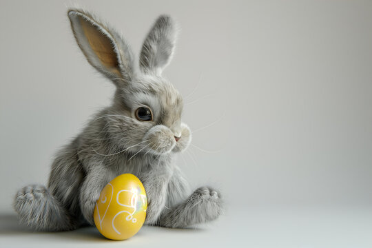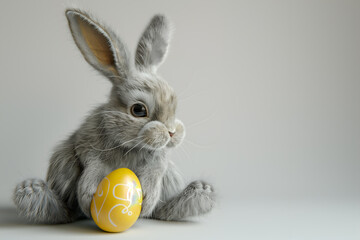 Cute Easter gray bunny wirh yellow egg on a gray background