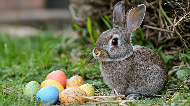 A small white fluffy rabbit is sitting on the green grass among the scattered Easter colorful eggs, with its front paws on a pink egg. Happy Easter. The banner